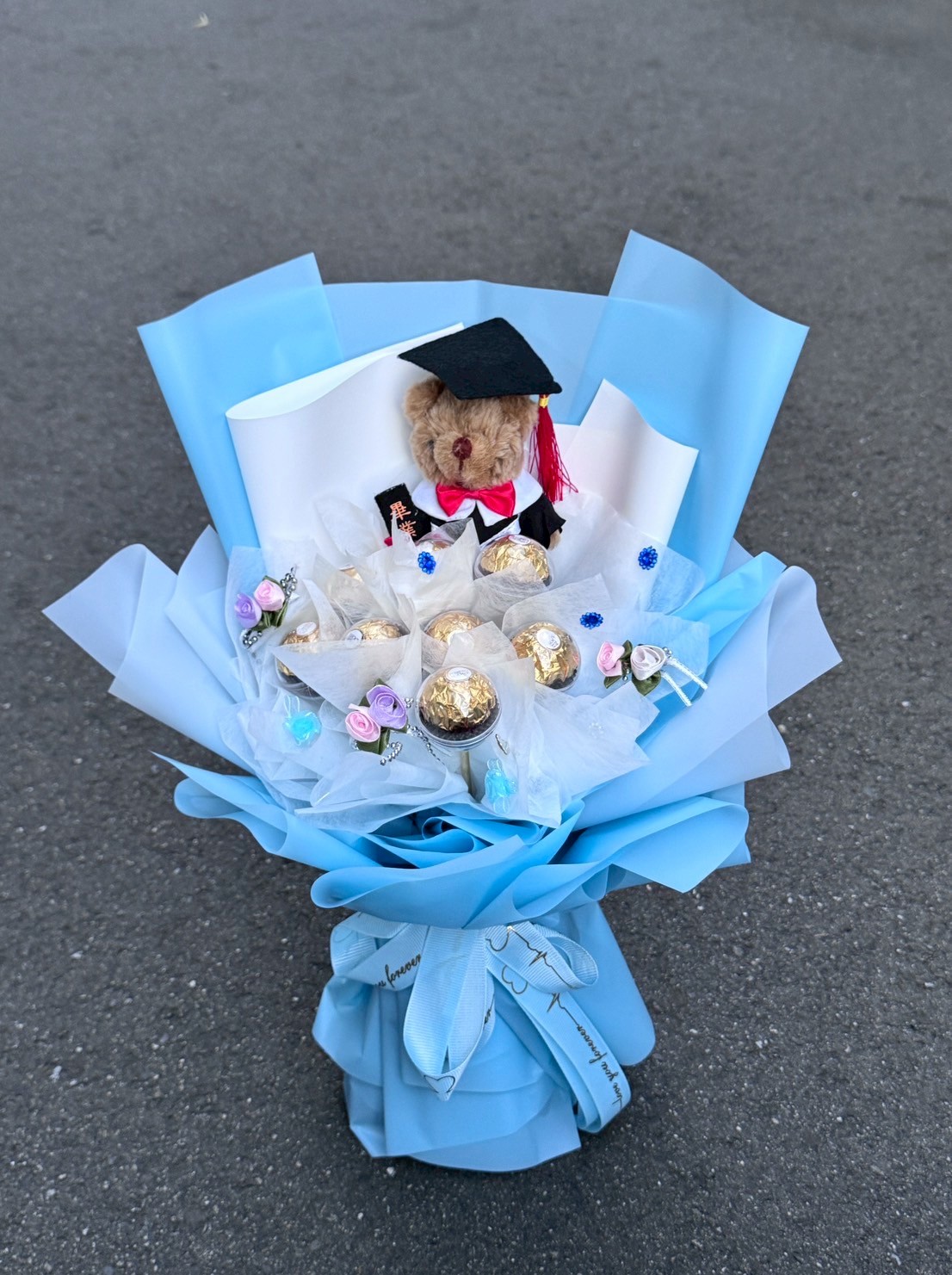 這款花束以溫柔粉為基調,搭配多顆金沙巧克力與Q版畢業小熊,整體充滿儀式感與青春氣息,超適合當作畢業禮、感謝禮或拍照道具!