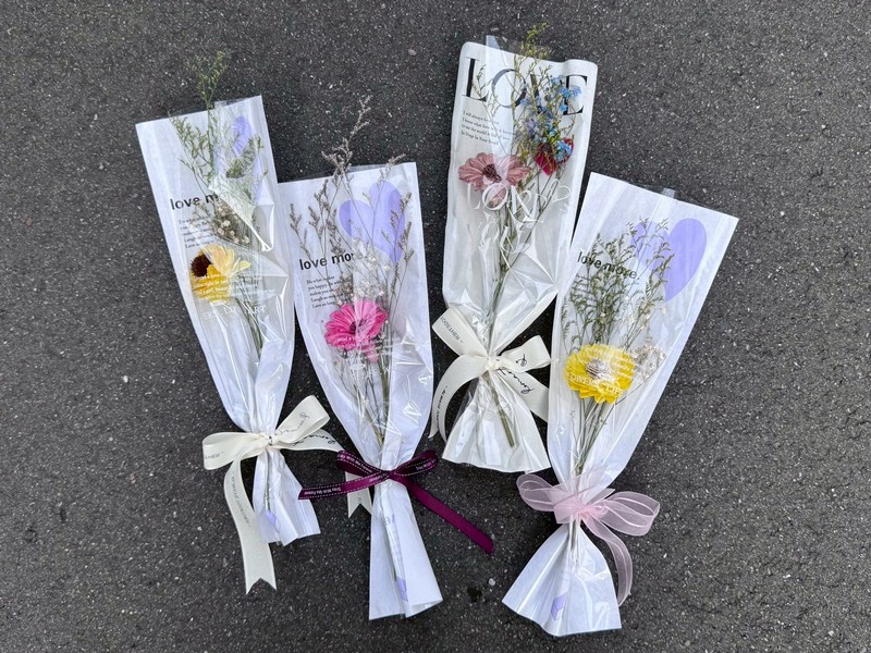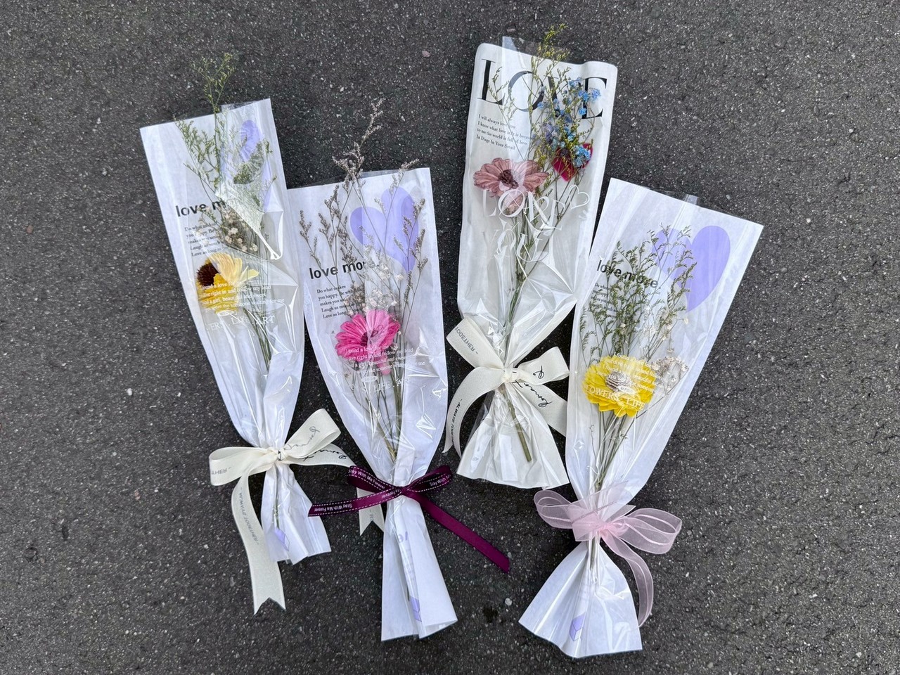 以乾燥滿天星等花材搭配手工包裝,每一束都獨一無二。