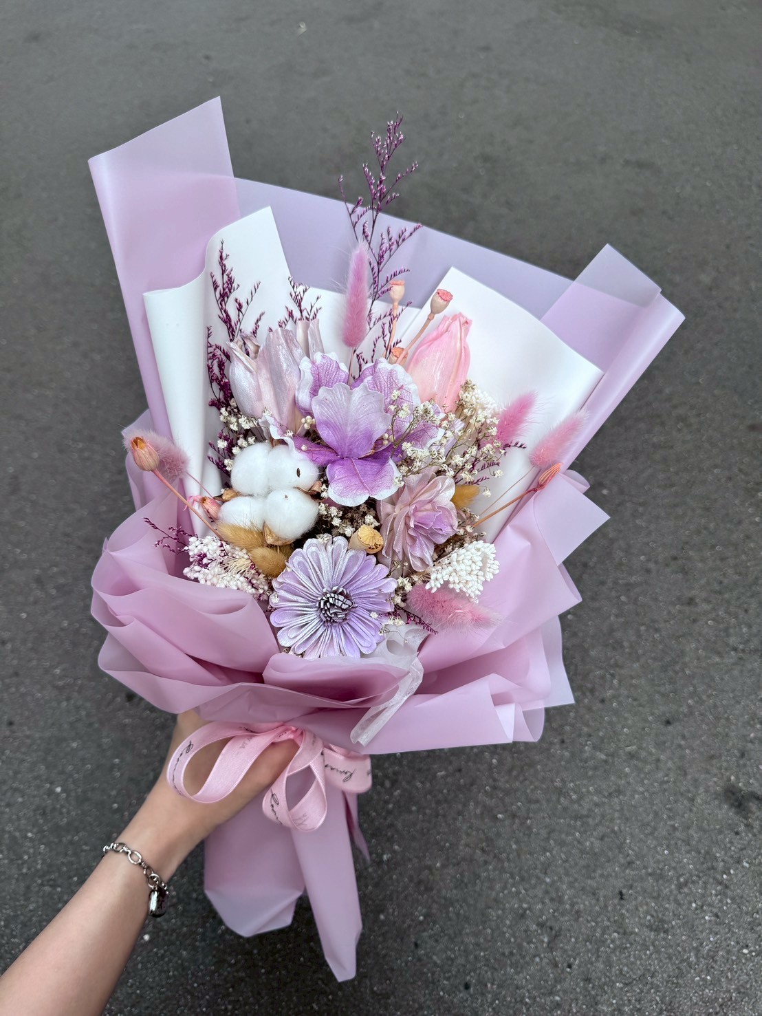 這款紫色乾燥花束以淡紫、薰衣草紫與白色為主調,搭配多款乾燥花材,呈現優雅而寧靜的氛圍,像是一場靜靜綻放的午後夢境。