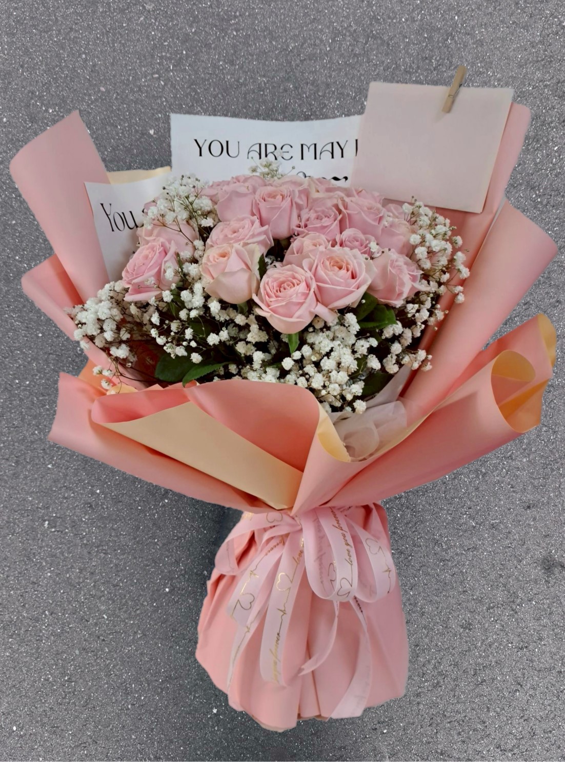 粉色玫瑰的溫柔,與滿天星的純白,一起說出你藏在心裡的情話。