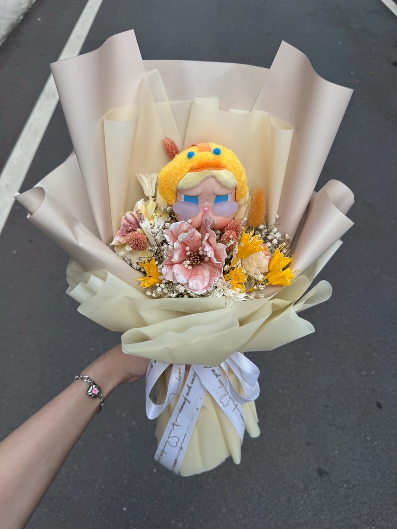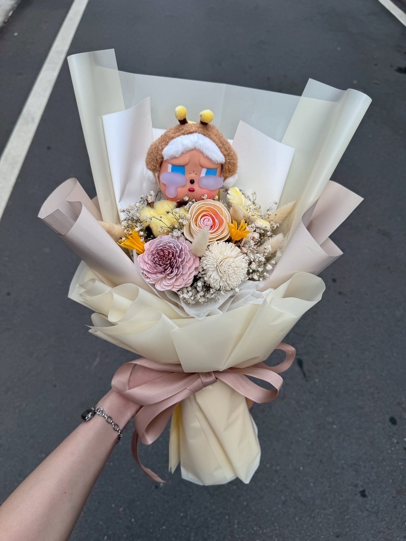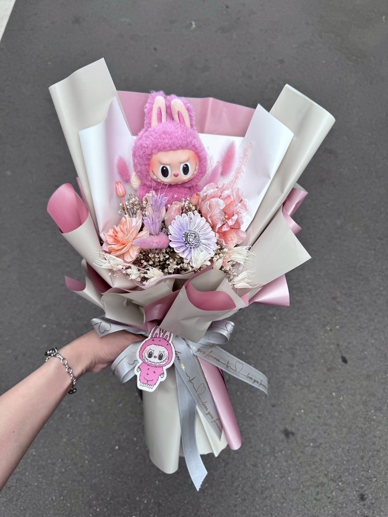 夢幻粉色系乾燥花束 + Labubu娃娃