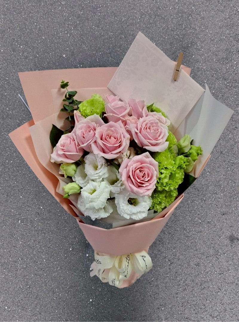 晨曦花語|橘粉玫瑰鮮花手綁花束