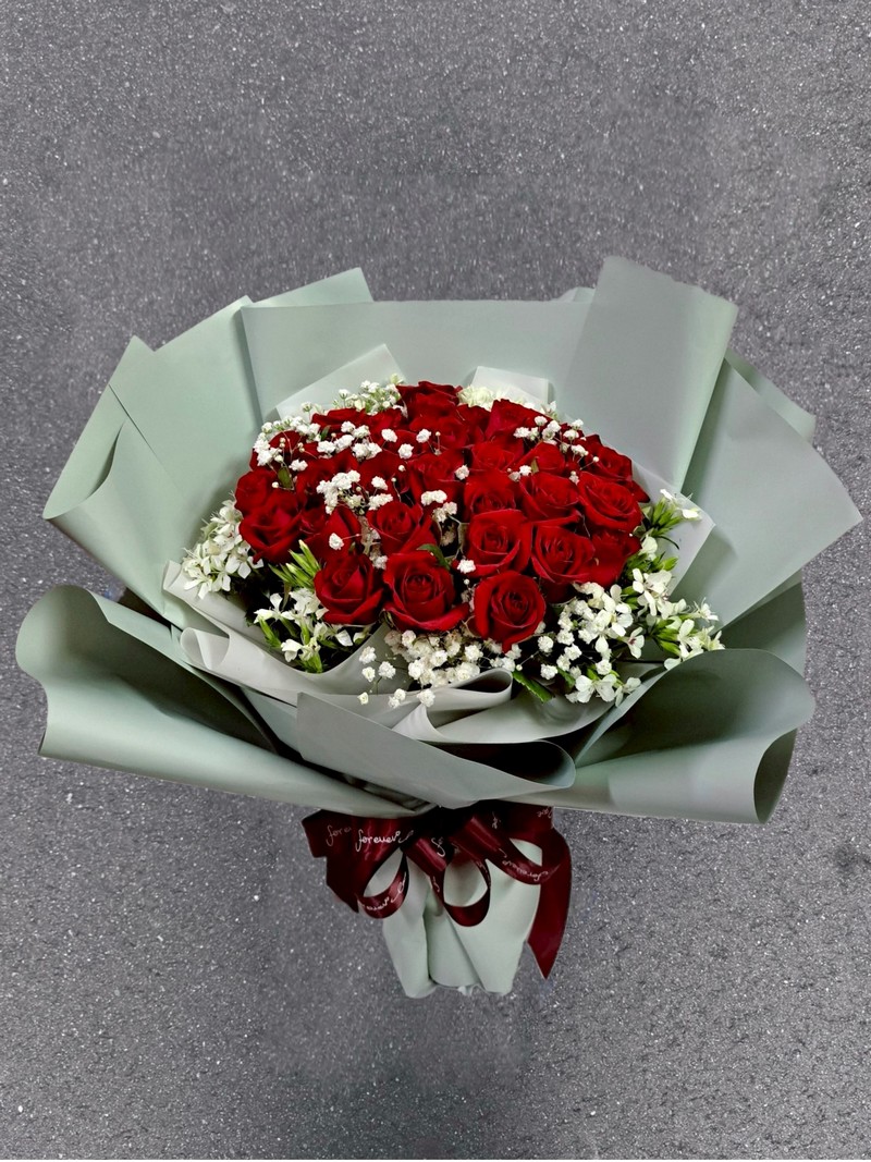 極致告白|大朵紅玫瑰滿天星花束|霧綠灰系包裝設計